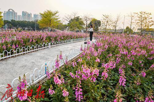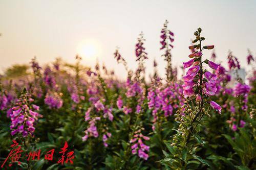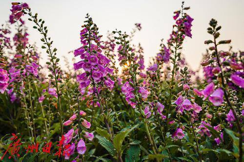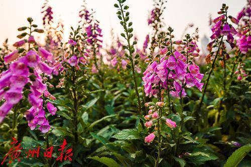 3月24日,在二沙岛的宏城公园,洋地黄在阳光下绚烂盛放,开成一片花海。花海背后,珠江新城的摩天大楼巍峨耸立,玻璃幕墙折射着城市的现代气息,广州塔以独特的曲线造型与柔美花海形成鲜明对比,勾勒出刚柔并济的城市景观。花海中,步道蜿蜒,市民游客穿梭其间:有人举着手机,定格花海与广州塔同框的绝美画面;有人悠然漫步,沉醉于繁花簇拥的浪漫氛围。
