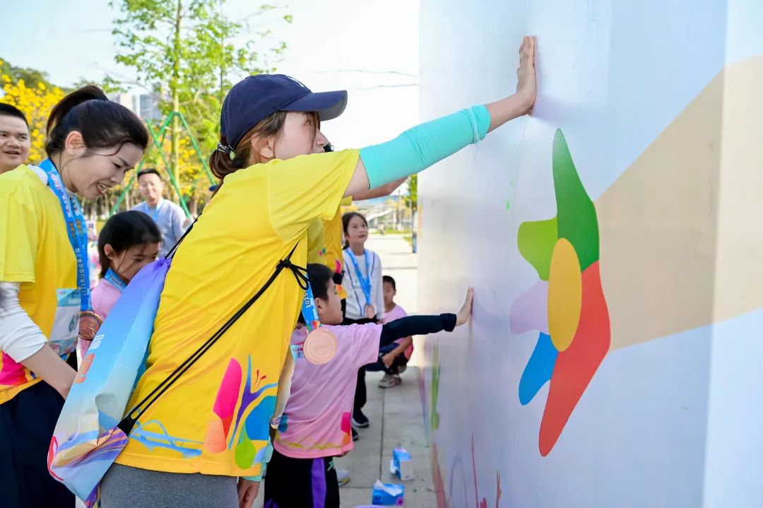 赛事注重参与体验感而非竞技性,倡导“体育+风景”的沉浸体验理念。选手可自主安排奔跑节奏,亲子跑家庭需在沿途打卡点完成趣味任务:在“彩虹印记·亲子手印墙”将浸染彩虹颜料的手印拓印成画;在“成语智趣·泡泡大闯关”破解成语谜题。两枚印章既是完赛凭证,更凝结着寓教于乐的亲子时光。