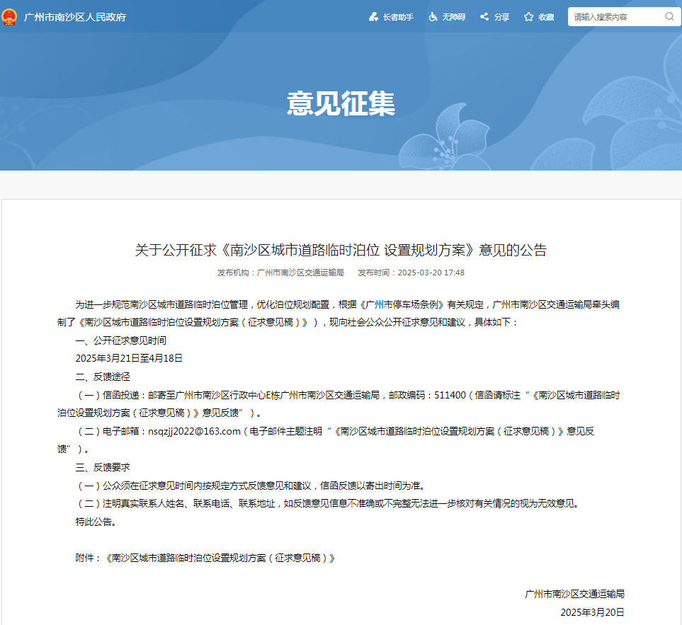 为进一步规范南沙区城市道路临时泊位管理,优化泊位规划配置,根据《广州市停车场条例》有关规定,近日,广州市南沙区交通运输局牵头编制了《南沙区城市道路临时泊位设置规划方案(征求意见稿)》,拟在区内新增10964个临时车位。现向社会公众公开征求意见和建议,本次意见征集至4月18日截止。