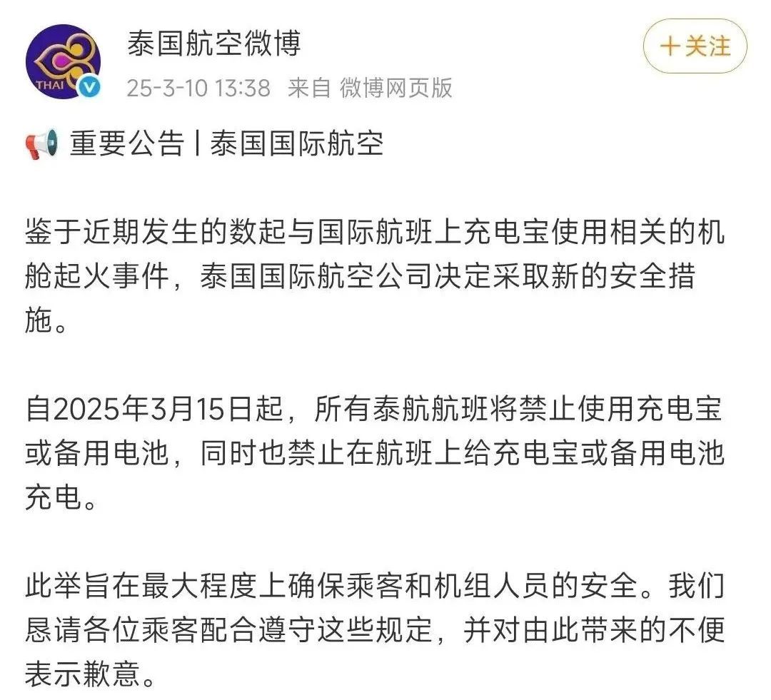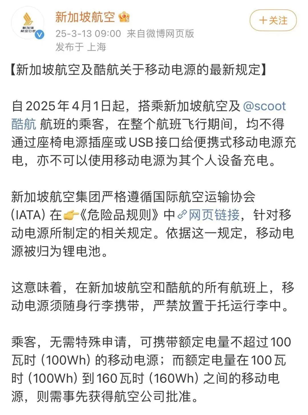 新加坡航空公司和酷航近日也宣布,自2025年4月1日起,严禁在飞行途中使用飞机上的USB接口给充电宝充电,严禁飞行途中用充电宝给个人设备充电。