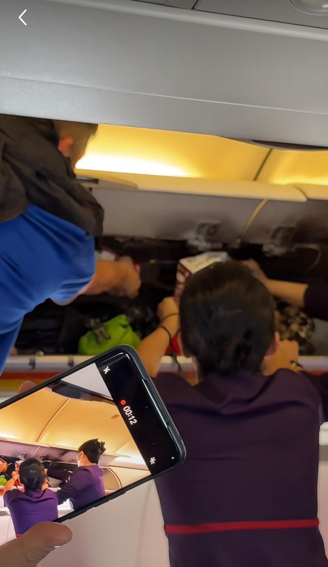 红星新闻注意到,事情发生后,不少自称该航班乘客的网友发视频称,起火后,乘客们都站出来伸手接力,把一瓶瓶水运到着火位置灭火,几名空乘人员和乘客甚至拿着果汁、可乐、牛奶向行李架上的一个背包不断注水。