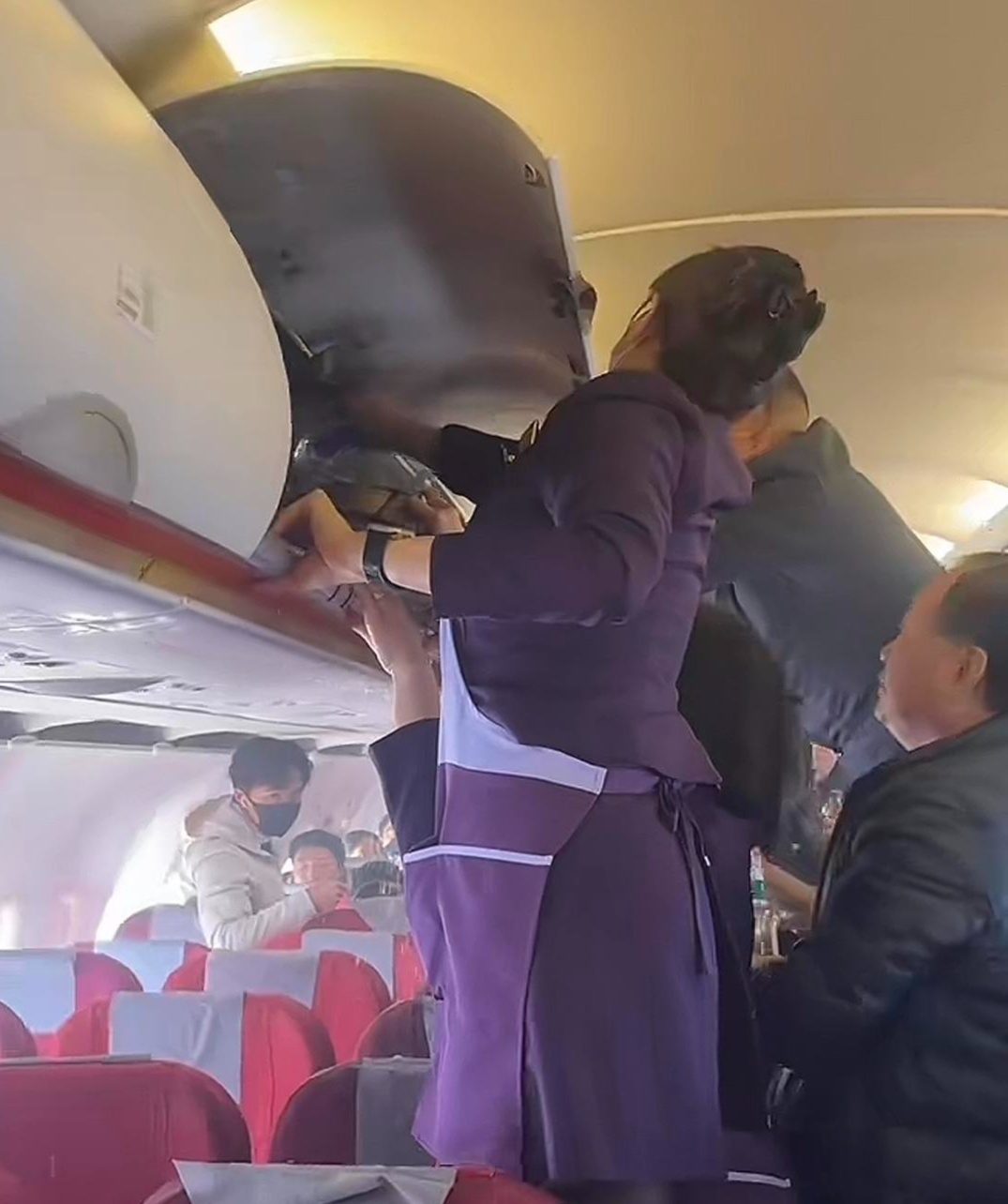 ▲现场画面显示,有多名乘客帮助空姐灭火