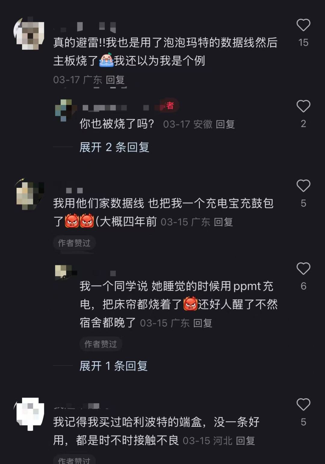 记者在社交媒体平台发现,关于泡泡玛特品牌数据线的质量投诉并非个例,多位网友反映泡泡玛特的数据线产品存在"使用寿命短""充电接口断裂"等问题。截至3月25日,该产品仍在广州多个线下渠道正常销售。该产品包装上注明,该数据线的制造商为北京泡泡玛特文化创意有限公司,产地为东莞。实际上,不只是泡泡玛特,多家潮玩公司生产的数据线与充电线均存在消费者对于产品质量安全的投诉。