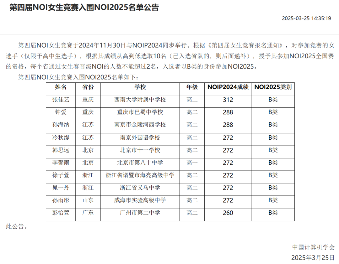 3月25日,中国计算机学会公布第四届NOI女生竞赛入围NOI2025名单。10人之中,重庆、江苏、北京、浙江等地各2人入选,山东与广东各1人入选。广州市第二中学的彭怡萱同学入围受关注。