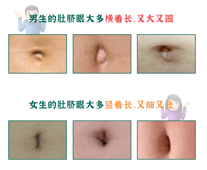 此外,男性和女性的肚脐形状也不太一样。男性肚脐圆形和椭圆形较多,而女性则椭圆形和纵形较多。
