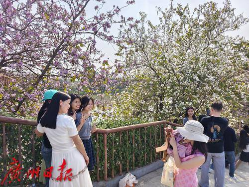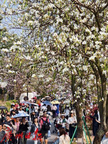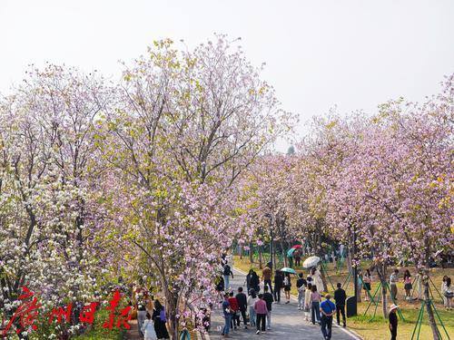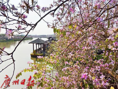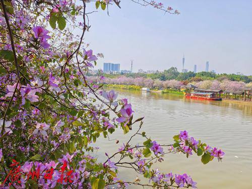 近日,海珠湿地公园内,石榴岗河两岸3.2公里的宫粉紫荆花正迎来盛花期,粉白相间的花朵如云似霞,将整个公园装点得分外妖娆。