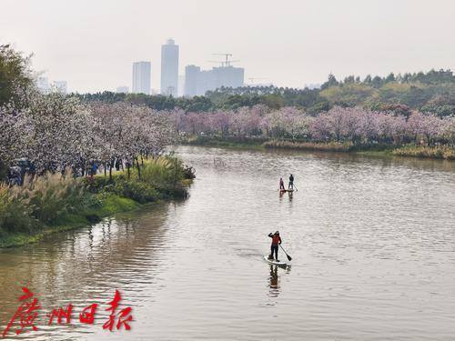 小船和皮划艇划过石榴岗河,两岸是美丽的花景。