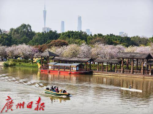 近处的花海、游人、游船与远处的城市构成了一幅城市与自然的和谐共生的美丽画卷。