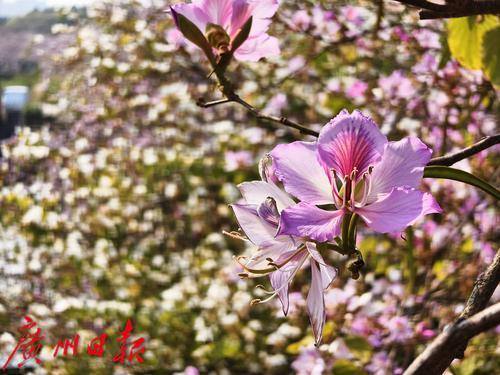 宫粉紫荆花粉白相间的花朵如云似霞,将整个公园装点得分外妖娆。
