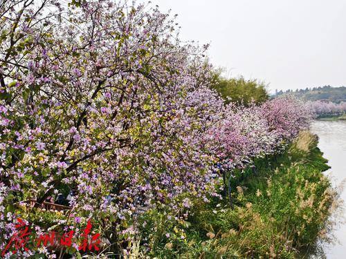 石榴岗河两岸3.2公里的宫粉紫荆花正迎来盛花期。