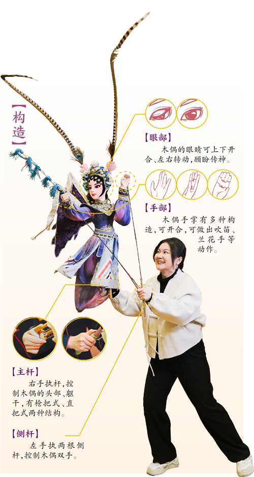 在崔师傅带领下,小麦走进排练厅,迎面看到两排色彩鲜艳的杖头木偶,唐僧四师徒、花木兰、苏轼……这些木偶造型精致,其内部结构也充满巧思。崔师傅通过剧目展示来“带练”,以《帝女花》中公主一角的木偶介绍结构,“木偶的头部、双手都装了操纵杆,这个木偶采用枪把式主杆,能灵活完成花旦柔美娇羞的动作。”只见崔师傅右手持主杆控制木偶头部,左手持两根侧杆流畅地完成甩袖等动作。