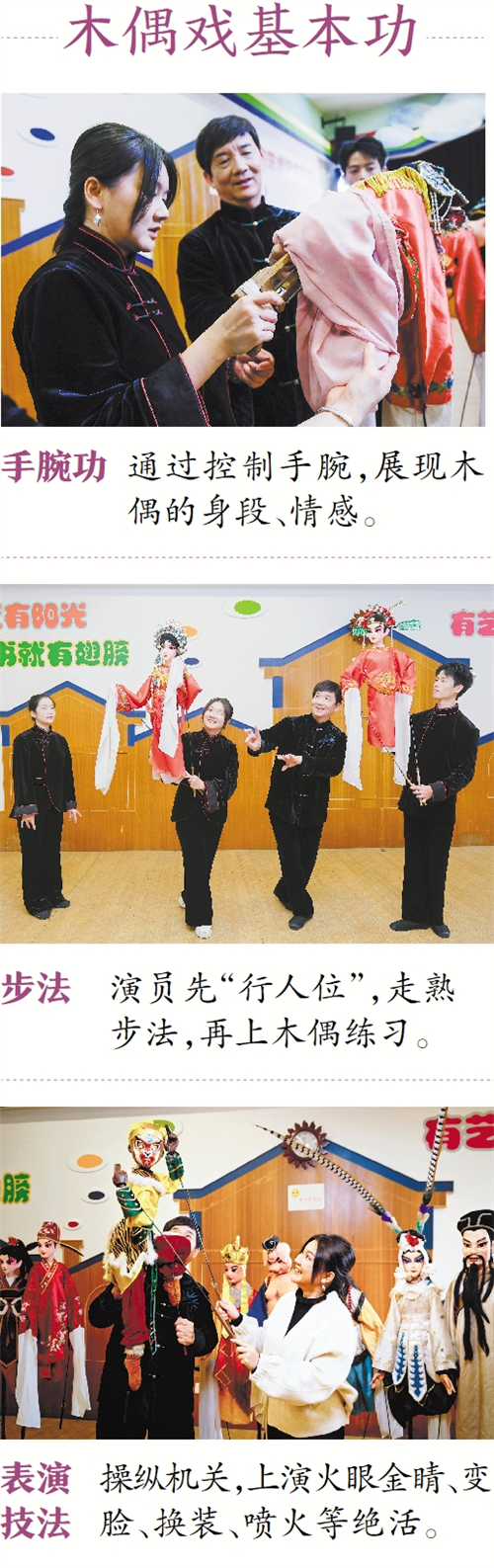 小麦练完举功,就要开始熟悉走位。排练剧目时,小麦要先“行人位”演绎角色动作,待步法清晰后,再上木偶练习。由于比普通演出多了一个步骤,木偶戏又有“间接的艺术”一说。木偶戏非常讲究手腕功,演员手腕起到木偶“大脑”的作用,木偶的身段、功架好不好看,全靠手腕。崔师傅拿起木偶示范起来:狂喜——木偶伴随“哈哈”笑声,仰头大笑,身体笑到微微颤抖;愤怒——木偶“哼”一声,身体前冲,怒气十足……演员全靠变换手腕力度、角度来传递木偶的不同感情。