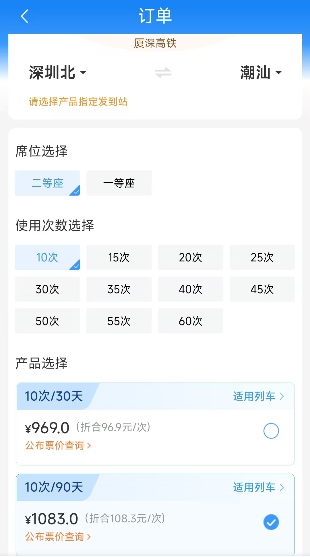 以深圳北站往返潮汕站的二等座为例,购买“30次/30日”定期票相比逐次购票可节省约855元,购买“60次/30日”定期票相比逐次购票可节省约2599元,相当于日均通勤成本降低近40%。