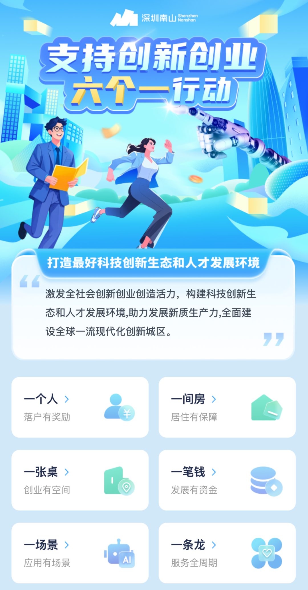 作为深圳的经济大区、科技强区、创新高地,南山通过将“一个人”“一间房”“一张桌”“一笔钱”“一场景”“一条龙”六个维度的15条创新保障举措打包成“放手追梦大礼包”,为来南山求职和创新创业的个人和团队全方位“保驾护航”。目前,“i南山”和“南山通”小程序已同步上线申请端口。
