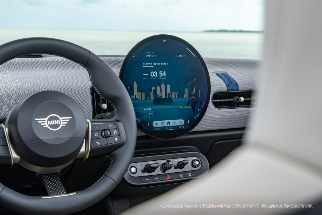 全新MINI Cooper Cabrio搭载的行业首个圆形 OLED 中控屏,集成 “敞篷计时器” 功能,实时记录敞篷时长并以动画形式展示天气与温度,将驾驶乐趣具象化。