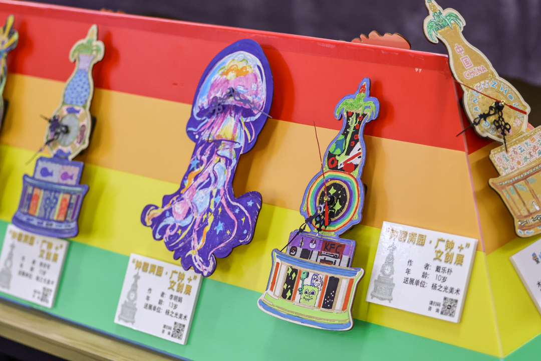在青少年艺术创意作品展区,作品以广钟真品样式作板面,或描画传统纹样、岭南风貌,或勾勒现代线条、缤纷色块,用不同的风格表达对时间的理解,让非遗焕发出新的光彩。