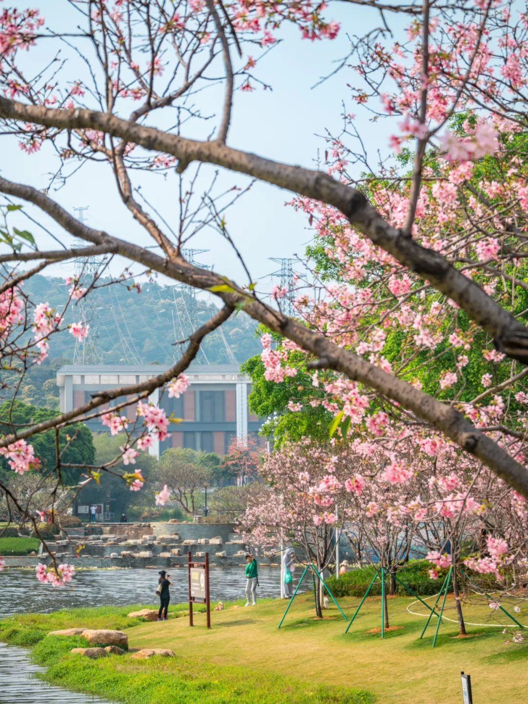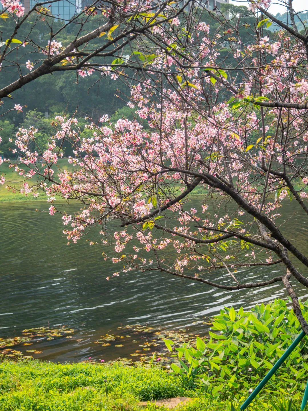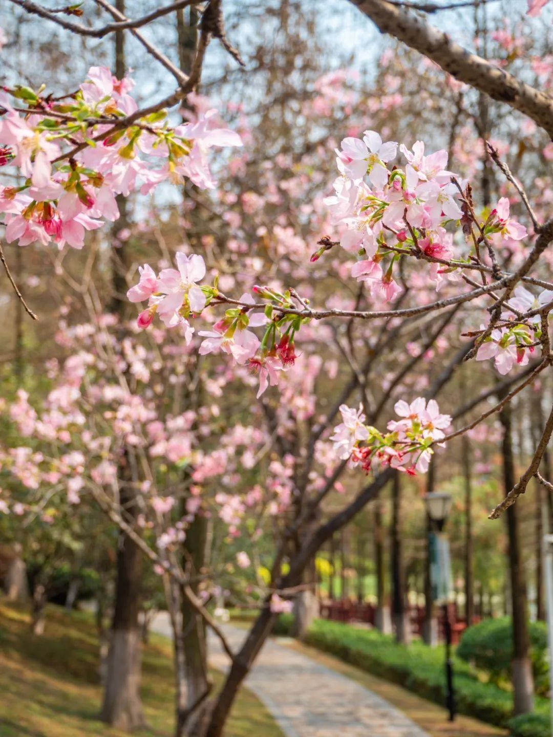 作为广州春季最热门的赏樱胜地之一,创业公园内种植了六百多株樱花,包括“中国红”(寒绯樱)和“广州樱”两个品种。