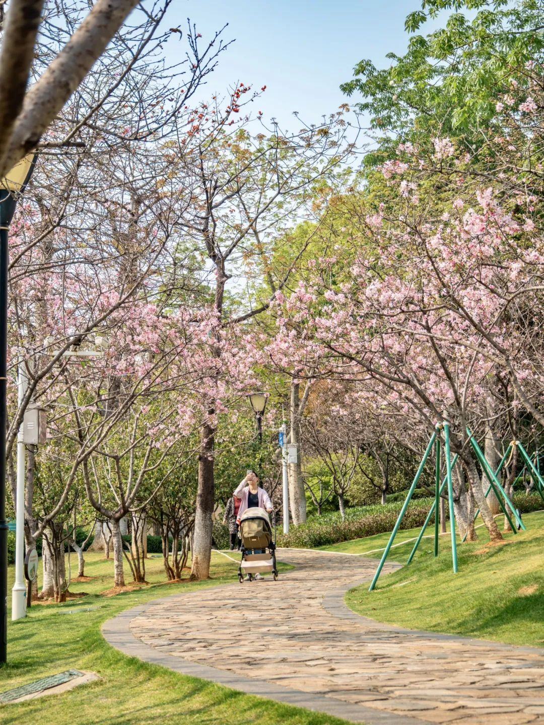 漫步沿湖步道,穿行粉色花海,阳光透过花瓣洒下细腻光影,空气中弥漫着淡淡清香。