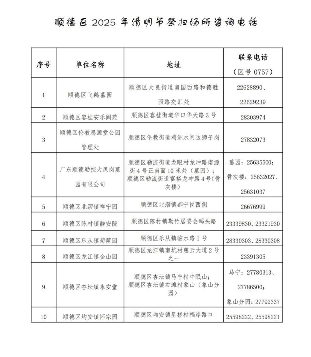 2025年清明节将至,为充分满足市民群众的祭扫需求,持续深化我区殡葬改革成果,有效防范山火及安全事故,切实保障全区人民生命财产安全,依据《佛山市顺德区人民政府森林防火禁火令》,结合我区清明节工作具体部署,今年清明期间,我区各殡葬服务机构将全面推行“文明祭扫”,倡导以一束鲜花或一炷清香缅怀先人、寄托哀思。现将有关事项通告如下: