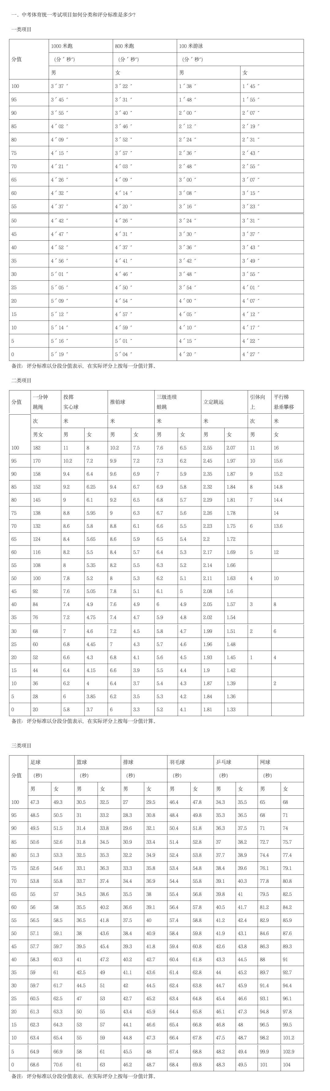 一、中考体育统一考试项目如何分类,评分标准是多少?