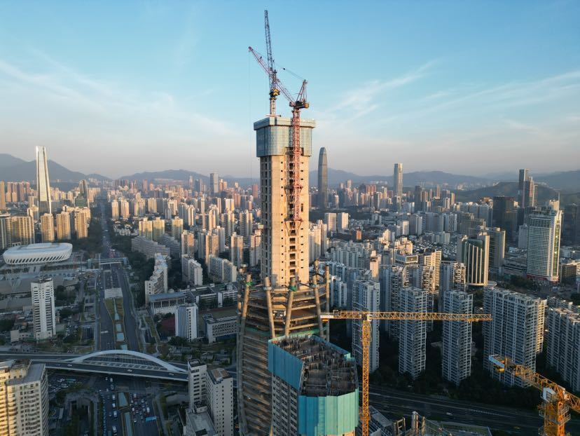 在福田湾区智慧广场的建设过程中,全国首次在单项目中同步应用住宅造楼机(168m人才房)与超高层空中造楼机(358m主塔),通过工业化生产模式打造立体化施工车间,人员减少50%、工期缩短25%。同时,项目还运用5G互联技术整合智能安全帽、远程塔机控制、单塔多笼电梯等装备数据,实现施工全过程实时监测与智能分析,以科技创新保障超高层施工安全及效率。