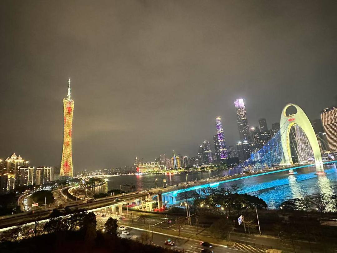 夜晚,广州塔华灯璀璨,与珠江两岸的夜景相互辉映。