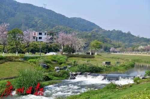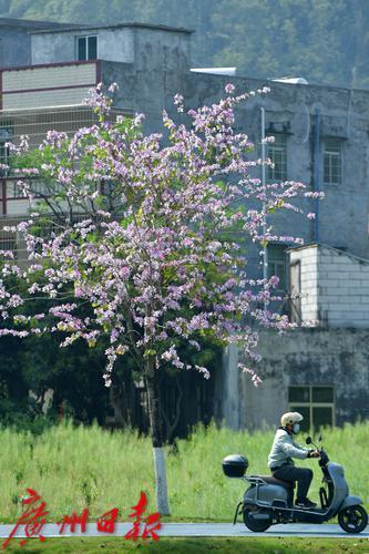 广州新龙镇金坑村沿金坑河沿岸的紫荆花盛开了,青山绿水的掩映下,随风摇摆的紫荆花将金坑村装扮地更加美丽。