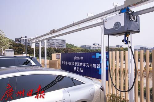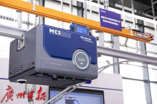 悬挂在轨道上的充电机器人,车主只需轻点手机,充电机器人就会沿空中导轨滑至车位上方自动对接。