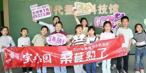 参观过程中,小朋友们积极提问,对宝桑园表现出了浓厚的兴趣,通过与工作人员的互动,他们了解到宝桑园专注深耕桑蚕领域20多年,全国布局六大自有种植基地,拥有百万亩桑葚种植面积以及三大现代化生产基地。当天,小朋友们还在“桑果色彩工坊”亲身体验非遗植物染,将桑果的天然色彩与布料相结合,在动手实践中感受桑蚕文化的多元魅力。