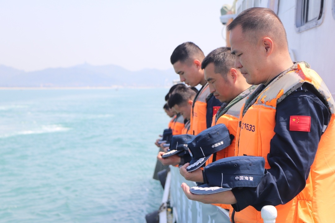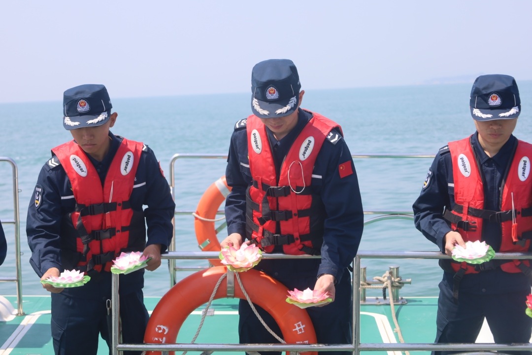 今年3月24日上午,马宫口海域浪卷云舒。执法艇犁开碧波,在当年汪晓龙倒下的坐标点上,菊花与祈福灯随潮起伏。辖区学校的学生与执法员并肩而立,将祈福灯放入海中。