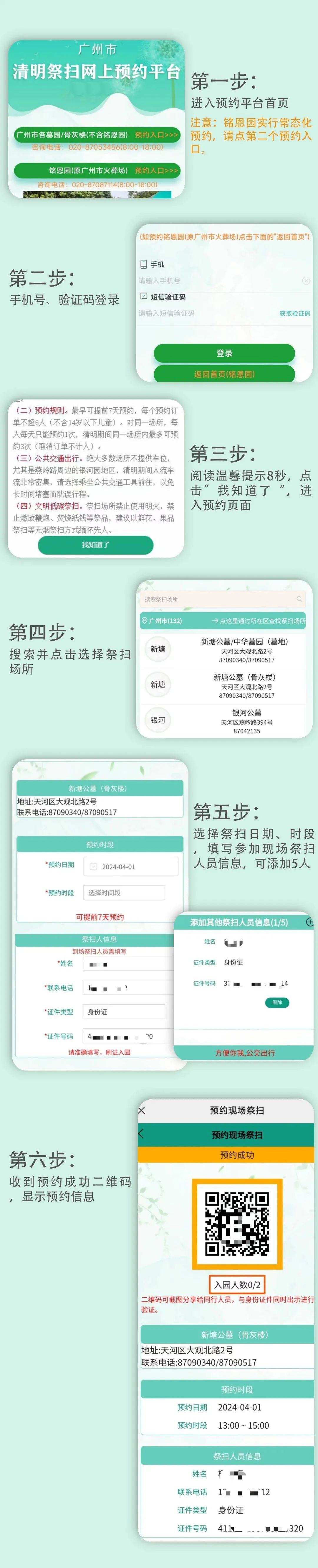 预约步骤:进入预约系统,选择祭扫场所,填写相关信息,完成预约(生成入场验证码、收到预约成功短信)。