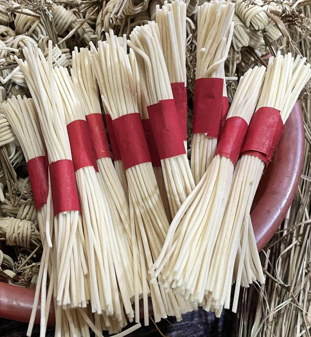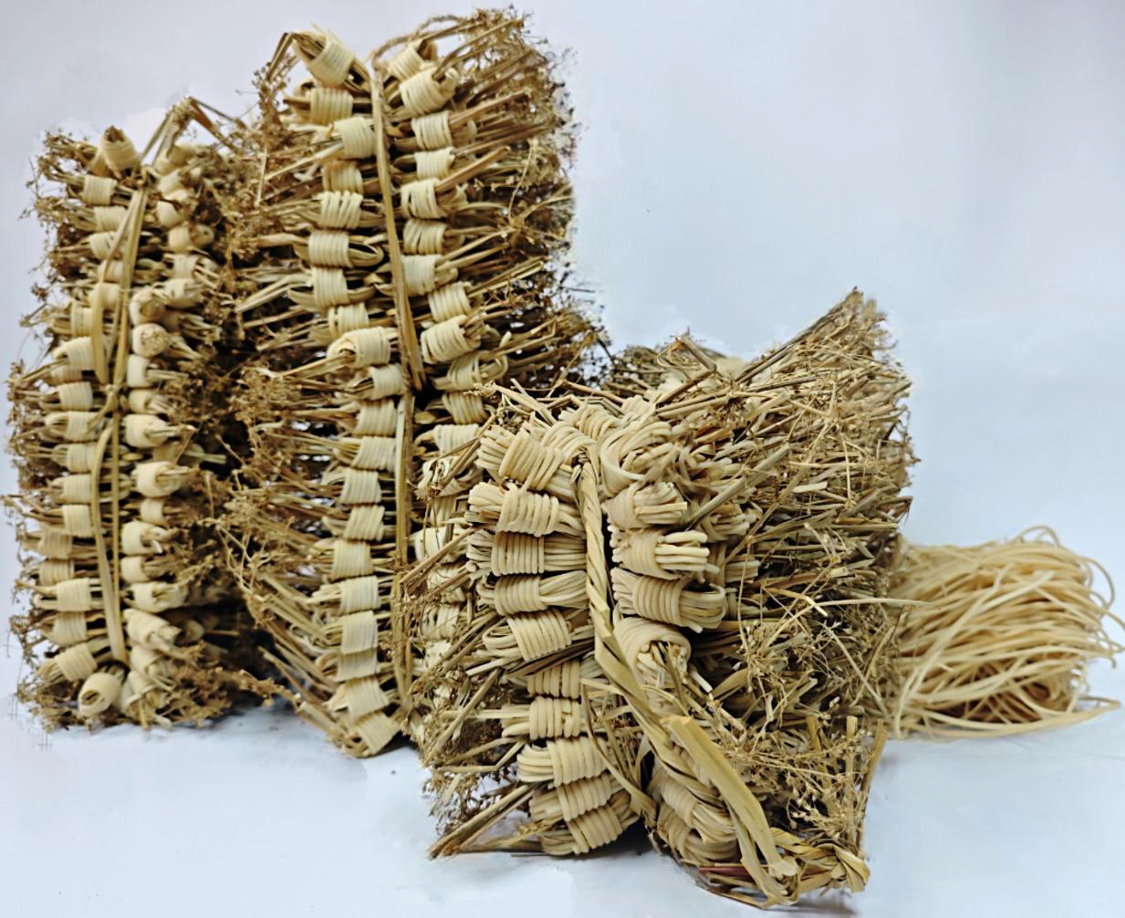 以前的大石妇女、小孩、老人闲暇时,会做灯芯花来帮补家计。梁阿姨自幼便学会了挑草、挢花,把挢好的灯芯花穿成一扎一扎拿去卖。梁阿姨表示:“制作灯芯花前,需先挑灯芯。将干草浸湿变软,晾晒一两个小时,再用专门的草挑工具对着灯芯草的表皮一割,白花花的灯芯就从草壳勾了出来,然后灯芯就可以拿来挢花了。”
