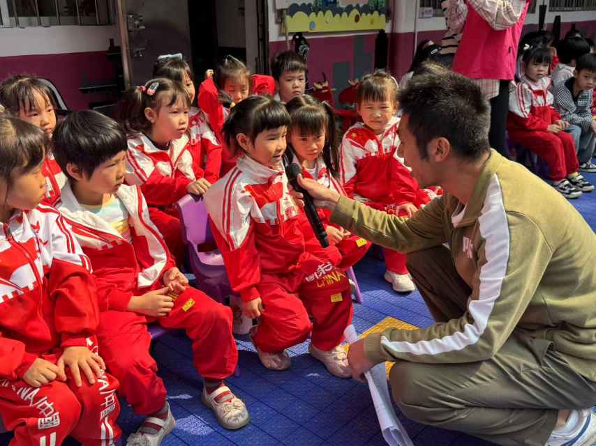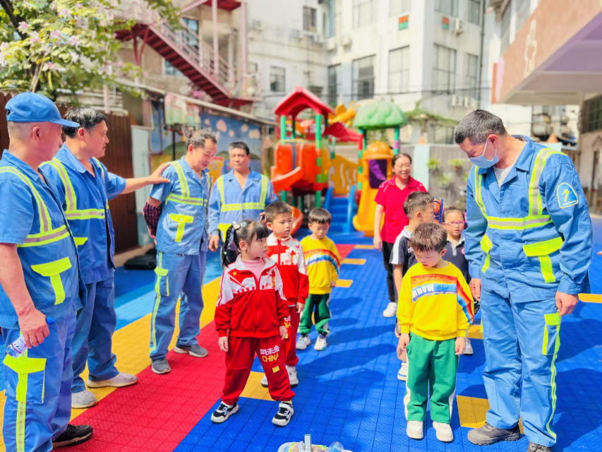 为了让孩子们更深入了解环卫工人工作,活动特别设置互动游戏“垃圾分类接力赛”。游戏中,幼儿与环卫工人两两一组,在环卫工人的鼓励和指导下,孩子们把模拟垃圾道具准确投放到对应的垃圾桶内。在欢声笑语中,孩子们不仅学会了垃圾分类,还与环卫工人建立起温暖的情谊,感受到他们日常工作的辛苦。