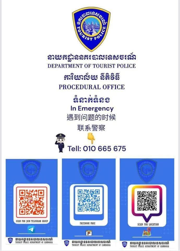 3月26日,柬埔寨国家警察总署旅游警察局公布中英柬三语网络诈骗投诉方式,在柬中国公民遇网络诈骗可拨打警方热线电话或扫描二维码通过社交媒体报案。