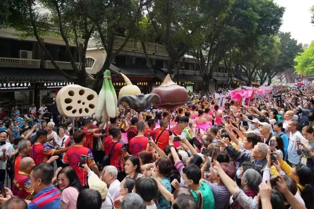 2024年“三月三”北帝诞巡游中,一组举着“泮塘五秀”(莲藕、马蹄、菱角、茭笋、茨菇)卡通形象的队伍成为当日“明星”,吸引着众多市民游客观看拍照,并在社交平台上刷屏,更有网友直呼“快出周边”。