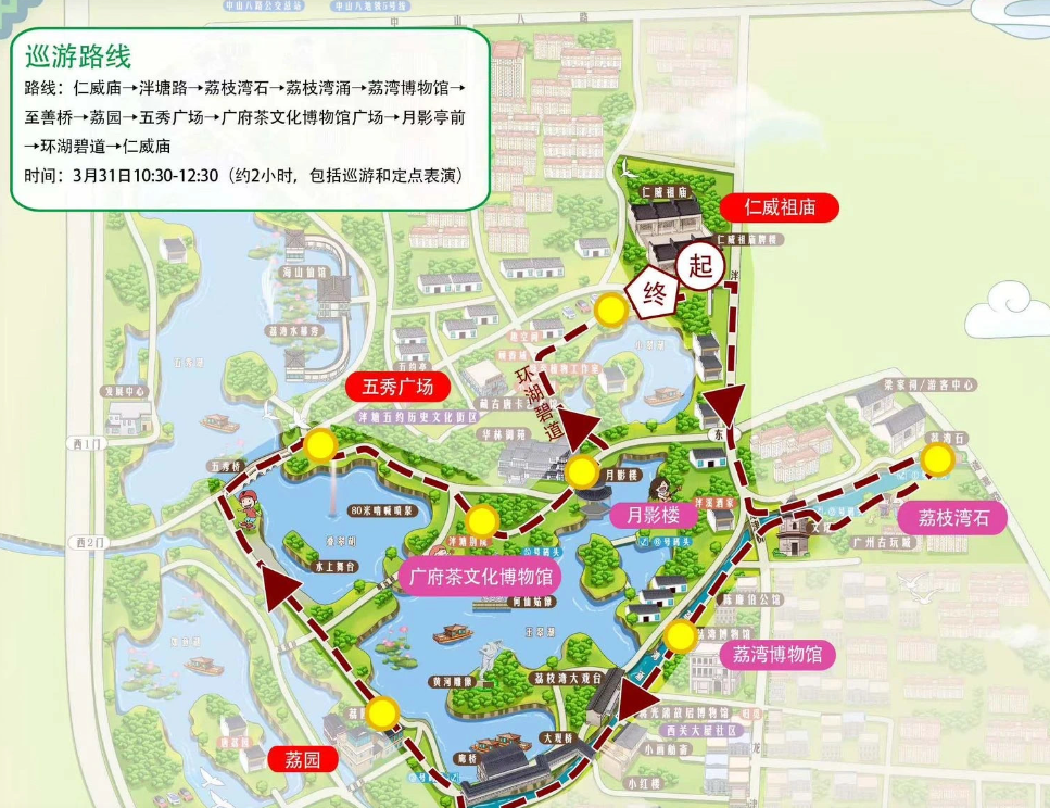 (二)巡游活动路线:仁威庙→泮塘路→荔枝湾石→荔枝湾涌→荔湾博物馆→至善桥→荔园→五秀广场→广府茶文化博物馆广场→月影亭前→环湖碧道→仁威庙。