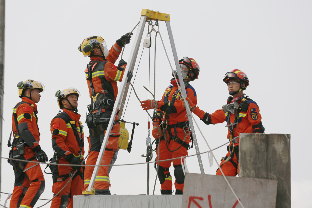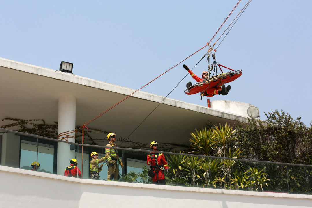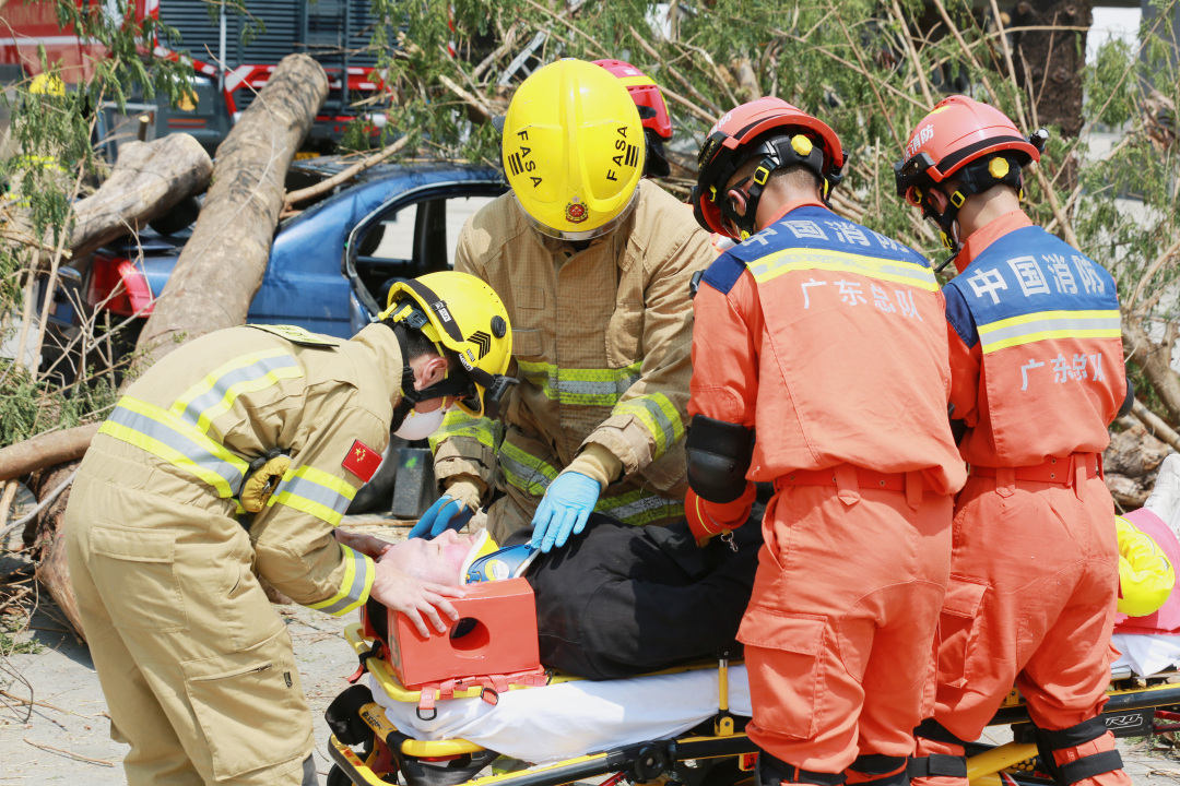 在建筑坍塌事故演练现场,救援人员需在模拟的废墟迷宫中精准定位被困者,利用生命探测仪和搜救犬展开“生死时速”。找准被困人员位置后,粤港澳三地消防员迅速共同制定营救方案,协作架设各类顶撑器材,忙而不乱、配合默契,利用支撑顶撑、生命支持等技术救出伤员,随后移交给现场医护人员进行救治。