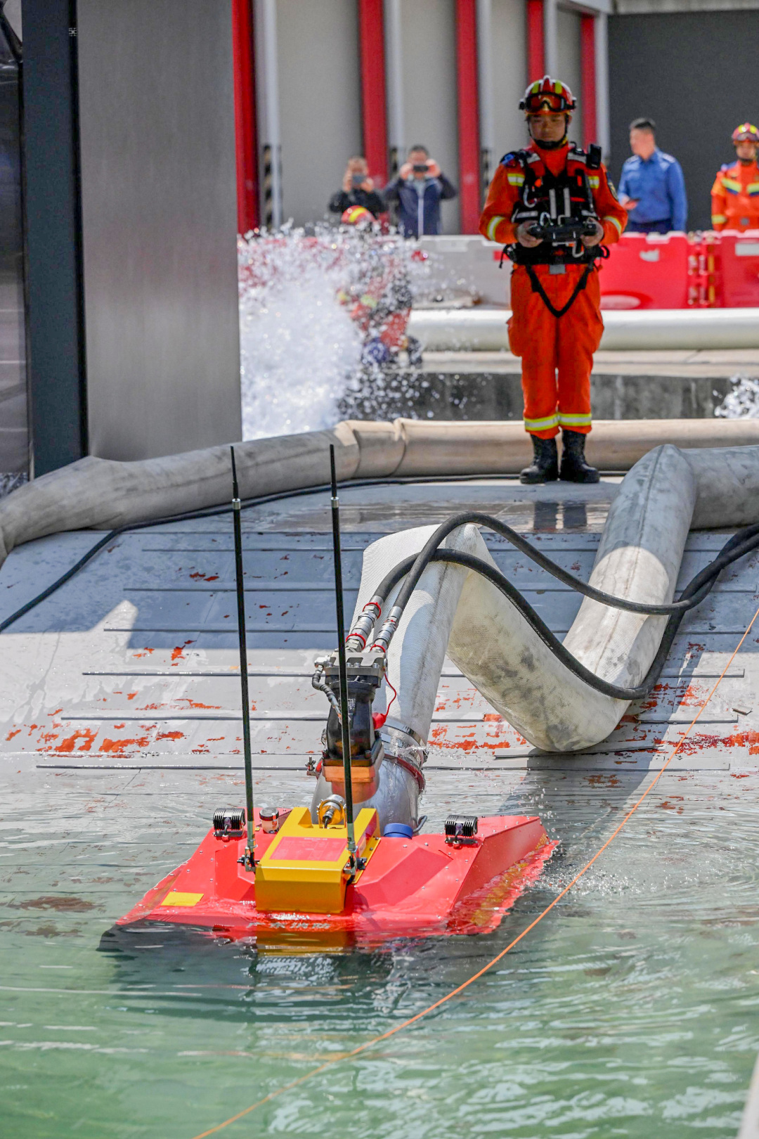 在地库停车场水浸事故科目现场,香港消防处潜水专队率先入水,在顺利营救落水车辆中的被困者后,操作探测水下机器人开展进一步搜救,同时3名广东省消防救援总队水域救援专业队操作履带式排涝机器人,对模拟内涝的地下车库展开排涝作业。
