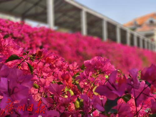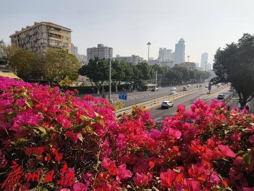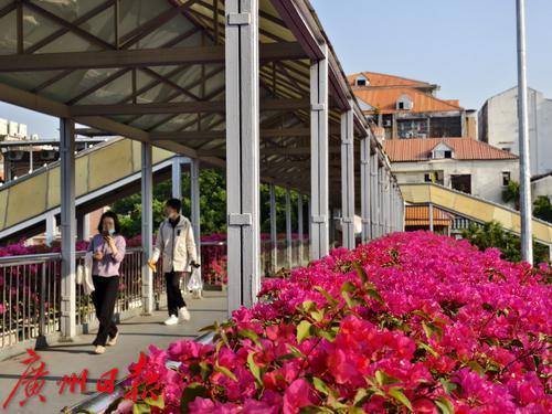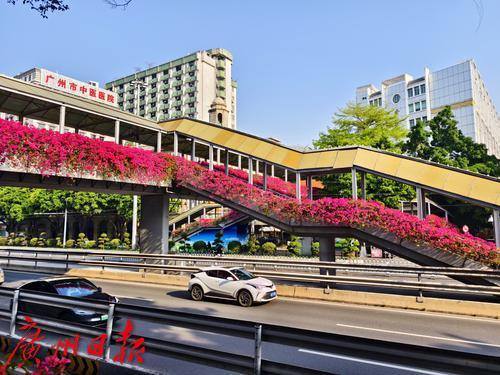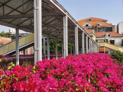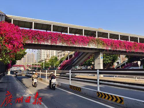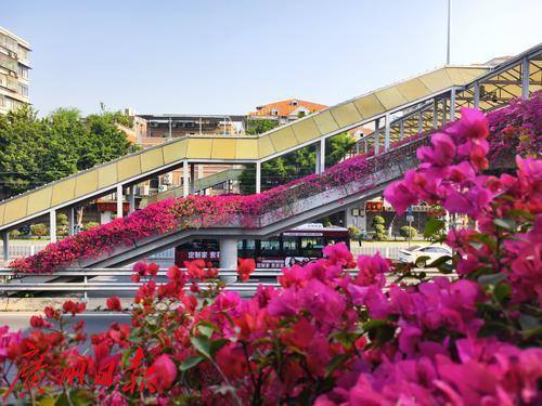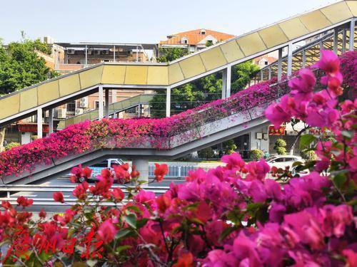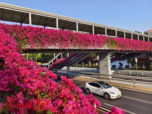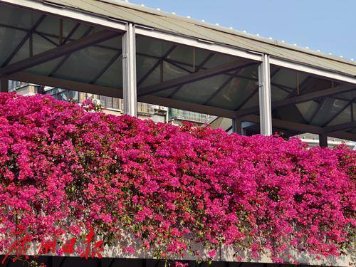 近日,六二三路两座横跨马路的人行天桥被盛开的勒杜鹃覆盖,形成了一道亮丽的风景线。