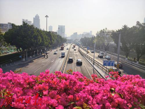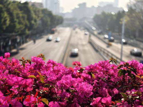 荔湾区六二三路的春日景象令人陶醉,两座横跨马路的人行天桥被盛开的勒杜鹃覆盖,形成了一道亮丽的风景线。这些鲜艳的粉红色花朵不仅美化了城市环境,也为繁忙的街道增添了一抹生机与活力。天桥下方,车辆川流不息,行人络绎不绝,远处的高楼大厦与近处的绿树红花相映成趣,构成了一幅现代与自然和谐共存的美丽画卷。在这春意盎然的季节里,广州的街道仿佛被鲜花装点成了一个巨大的花园。无论是驾车还是步行,人们都能在忙碌的生活中感受到春天的气息。
