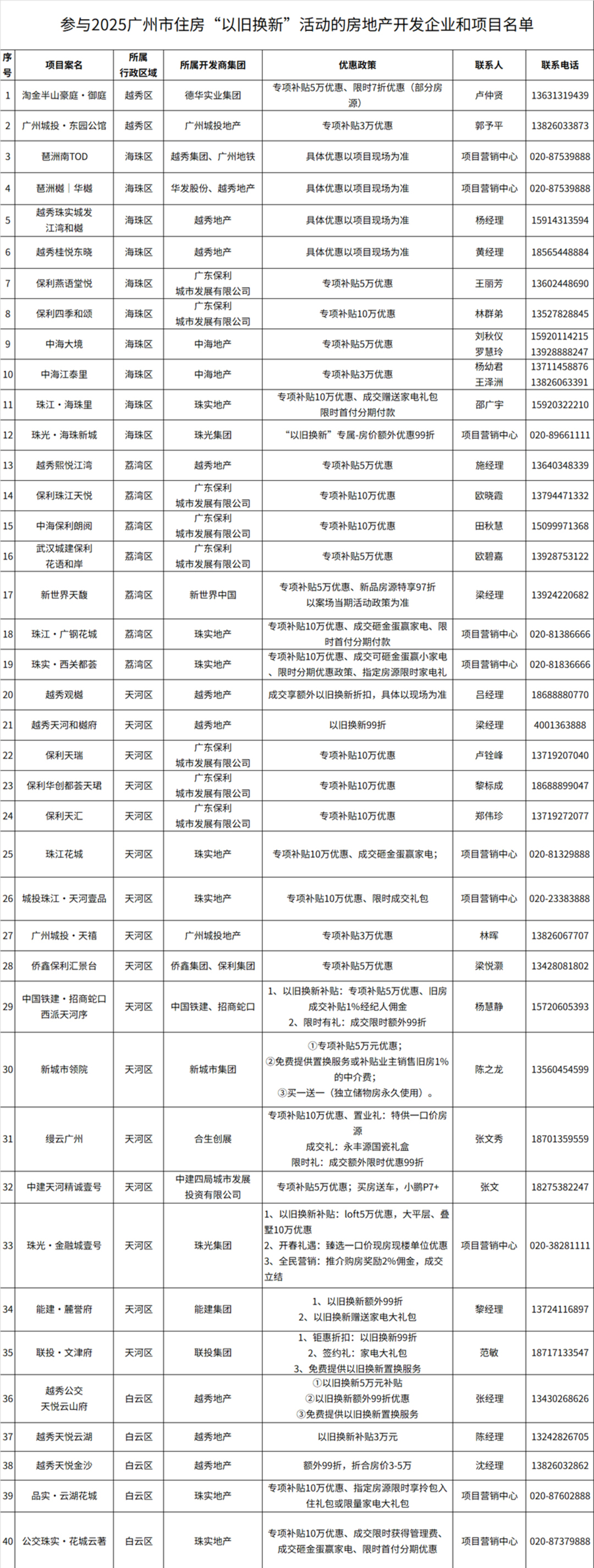 从首批参与活动的近70个在售新房项目来看,覆盖天河、越秀、荔湾、海珠、白云、番禺、黄埔、花都、增城、南沙等区域,其中天河、荔湾、海珠、白云等中心区项目占比较大,产品包括刚需项目、中心区改善项目等多种选择。参与项目大多提供了3万~10万元不等的购房补贴优惠。