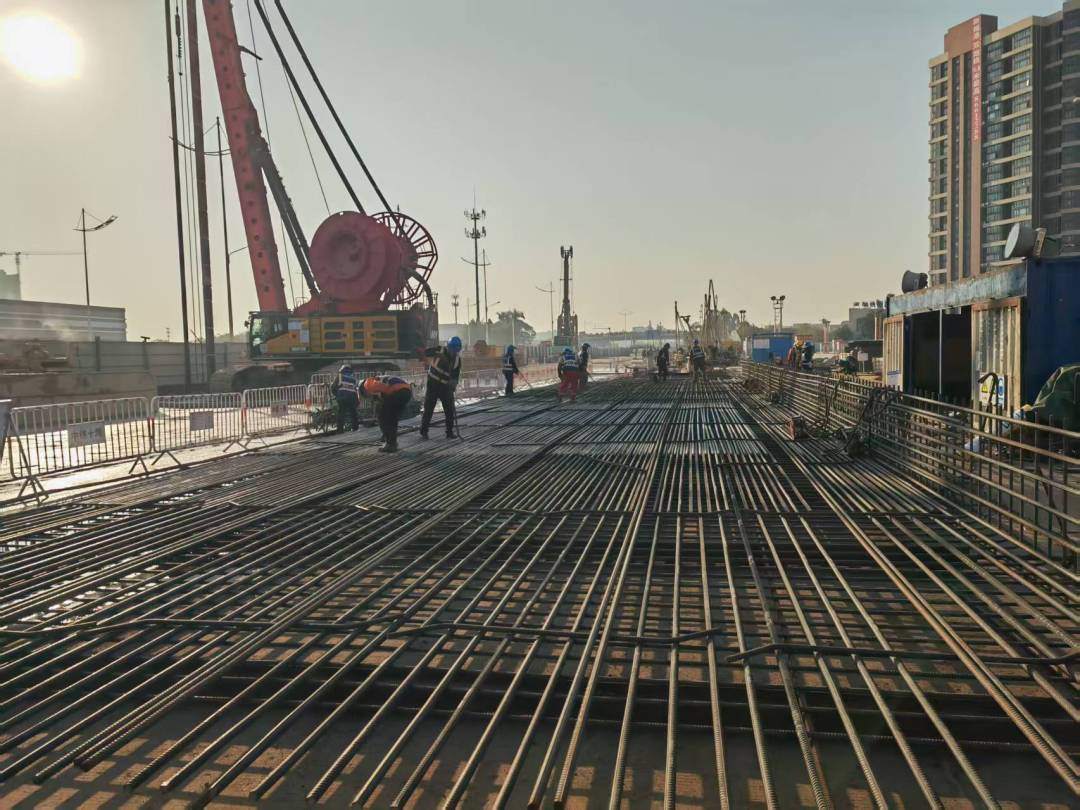 针对岩溶发育明显和砂层地质的挑战,广州地铁联合中铁广投八号线北延段支线总承包部、中铁十局,提前对地下连续墙两侧进行槽壁加固,严格控制泥浆比重,优化泥浆配比,避免因含砂量大、沉渣过厚导致成槽困难。成槽施工采用“旋挖钻引孔+双轮铣”组合工艺,旋挖钻引孔可快速穿透硬岩层,为双轮铣成槽创造条件,而双轮铣成槽效率高,可有效保证成槽质量。该工艺的应用,成功解决了岩层硬度大、成槽效率低的难题,大大提高了施工效率。