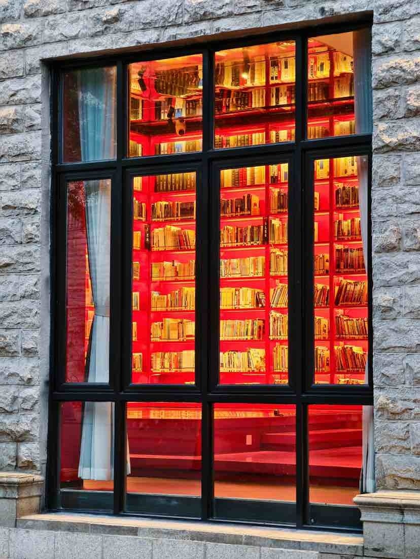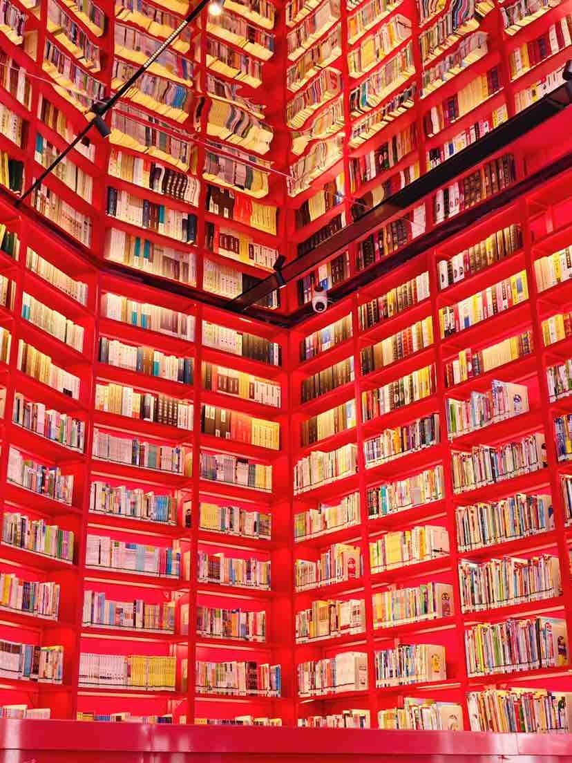 平层阅读区则采用红白配色,教堂式尖顶吊顶搭配5扇大落地玻璃窗,空间高挑空旷,极具现代浪漫风情。3.5米高的红底铁质书墙上,3000余册文学艺术、历史地理、少儿绘本等书籍静候选择。