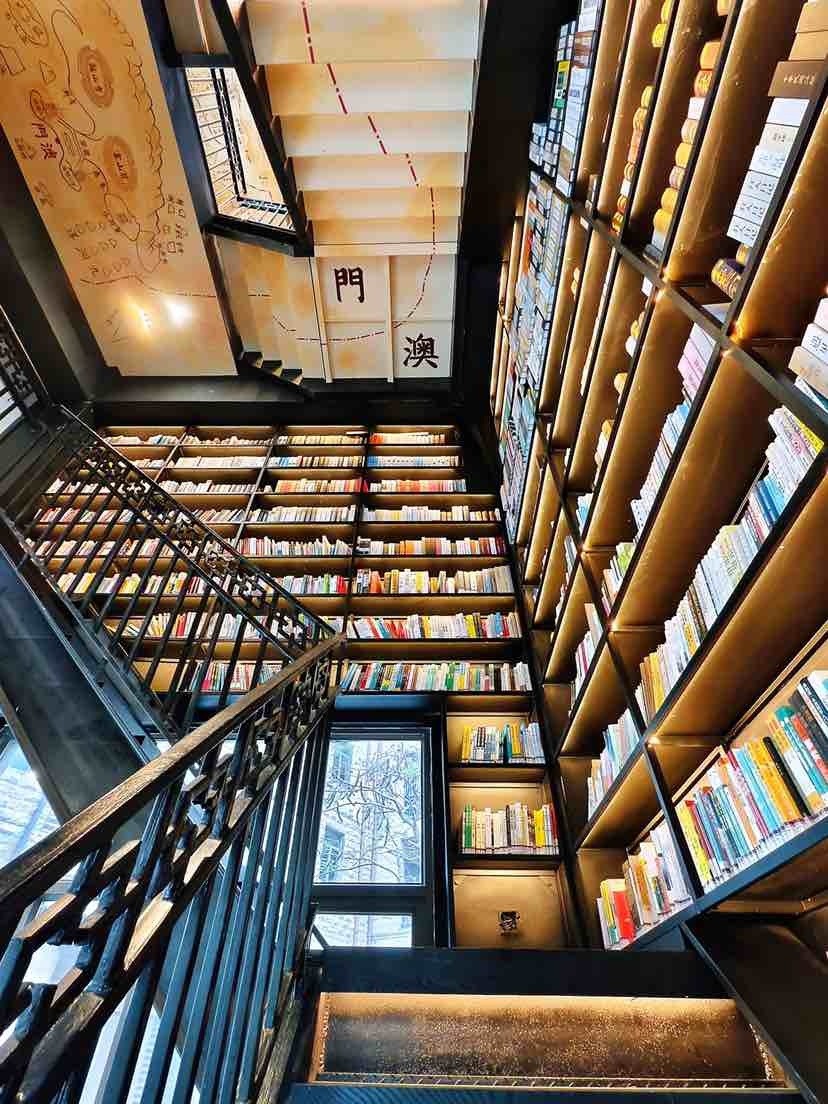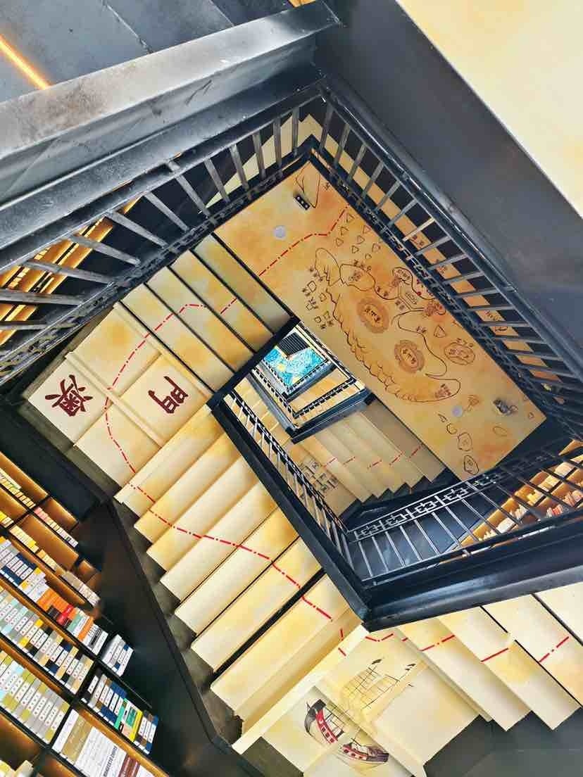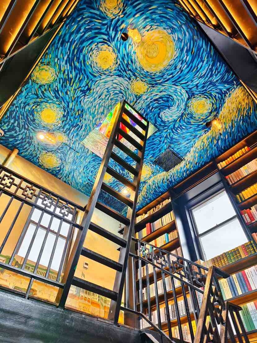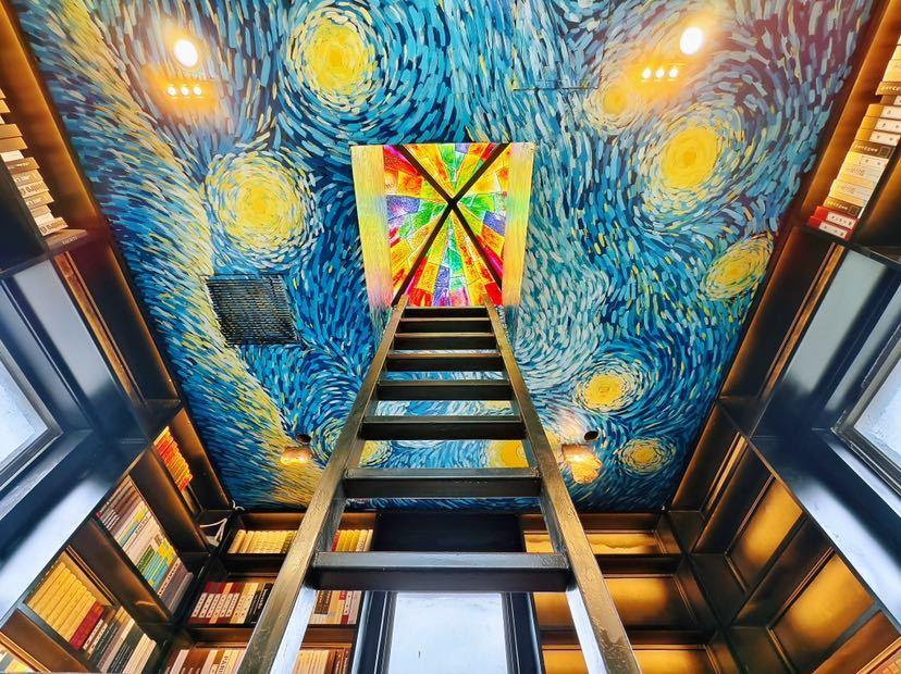 沿着铁质黑色旋转楼梯盘旋而上,抬头可见塔顶描绘着梵高的《The Starry Night》(星空),可感受历史的厚重与神秘感;楼梯上绘制的“澳门-虎门-黄埔港-广州十三行”历史商路图,将海上贸易的辉煌历史娓娓道来;墙面装饰的海上贸易场景画作,栩栩如生地展现了往昔的繁华盛景。从一楼至顶楼,分别用手绘的方式,展示了19世纪的澳门港口、虎门风光、黄埔港商船往来、十三行商船停靠等历史外销画,读者游客们沿着楼梯向上,俯首间仿若穿越时空,领略广州千年商都的魅力,一直延伸到顶部。灯塔顶部是梵高的星空手绘图和彩色玻璃窗,意味着人们从历史走向未来。馆内还设有咖啡吧台,读者游客可点一杯咖啡,读一卷好书,坐在窗边的木质茶几旁,感受浓厚咖啡香与馥郁的书香交织,享受悠闲时光。
