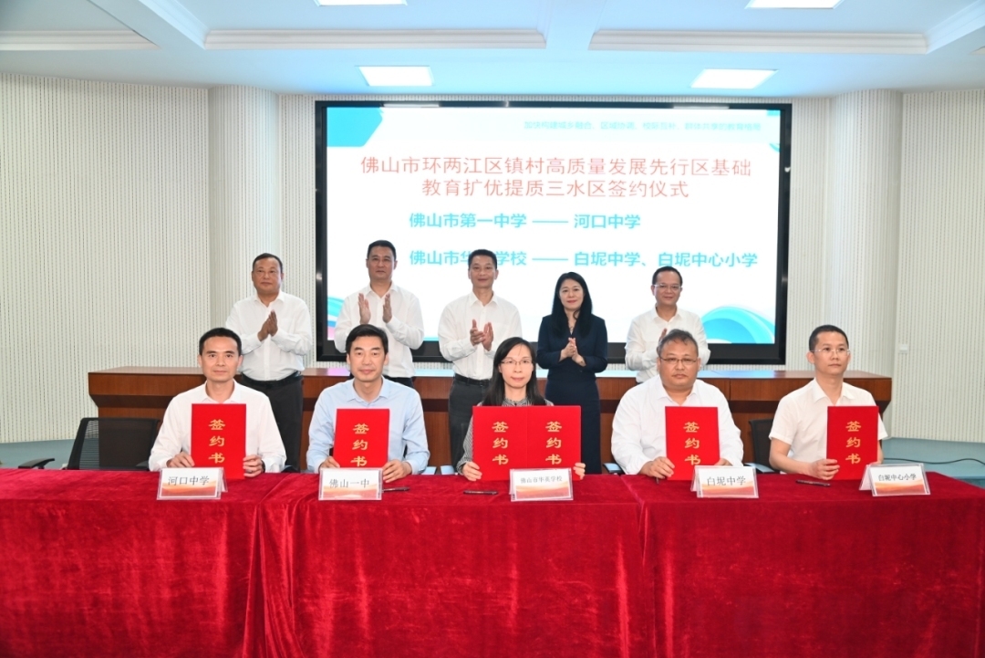 尤为值得关注的是,在佛山市环两江区镇村高质量发展先行区基础教育扩优提质三水区签约仪式环节,佛山市第一中学与三水区河口中学,佛山市华英学校与三水区白坭中学、白坭镇中心小学分别签订托管协议。