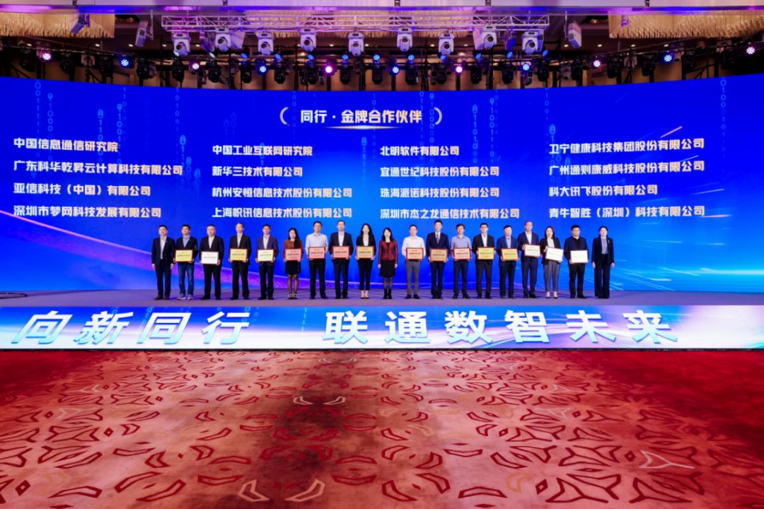 广东联通宣布围绕算网数智、联网通信、科技数智三大领域打造“同行 共赢 智享”合作伙伴体系,并为金牌合作伙伴进行颁奖。