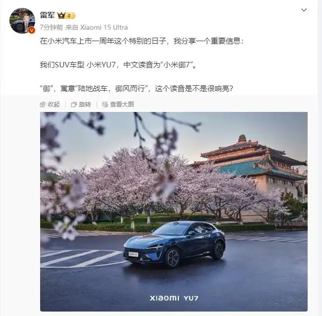 3月28日,雷军通过个人账号官宣:小米YU7中文读音为“小米御7”,寓意“陆地战车,御风而行”。