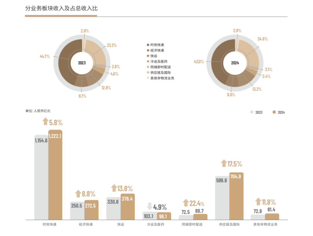 2024年,中国企业产品出海、产能出海和品牌出海带动跨境物流需求持续旺盛,顺丰在2021年收购KLN后,持续进行协同整合,打造了多元化物流网络,强化跨境快递及供应链服务能力,当下供应链及国际业务已经成了顺丰的第二增长曲线。年报显示,2024年顺丰的供应链及国际业务收入达到704.9亿元,增长近17.5%。