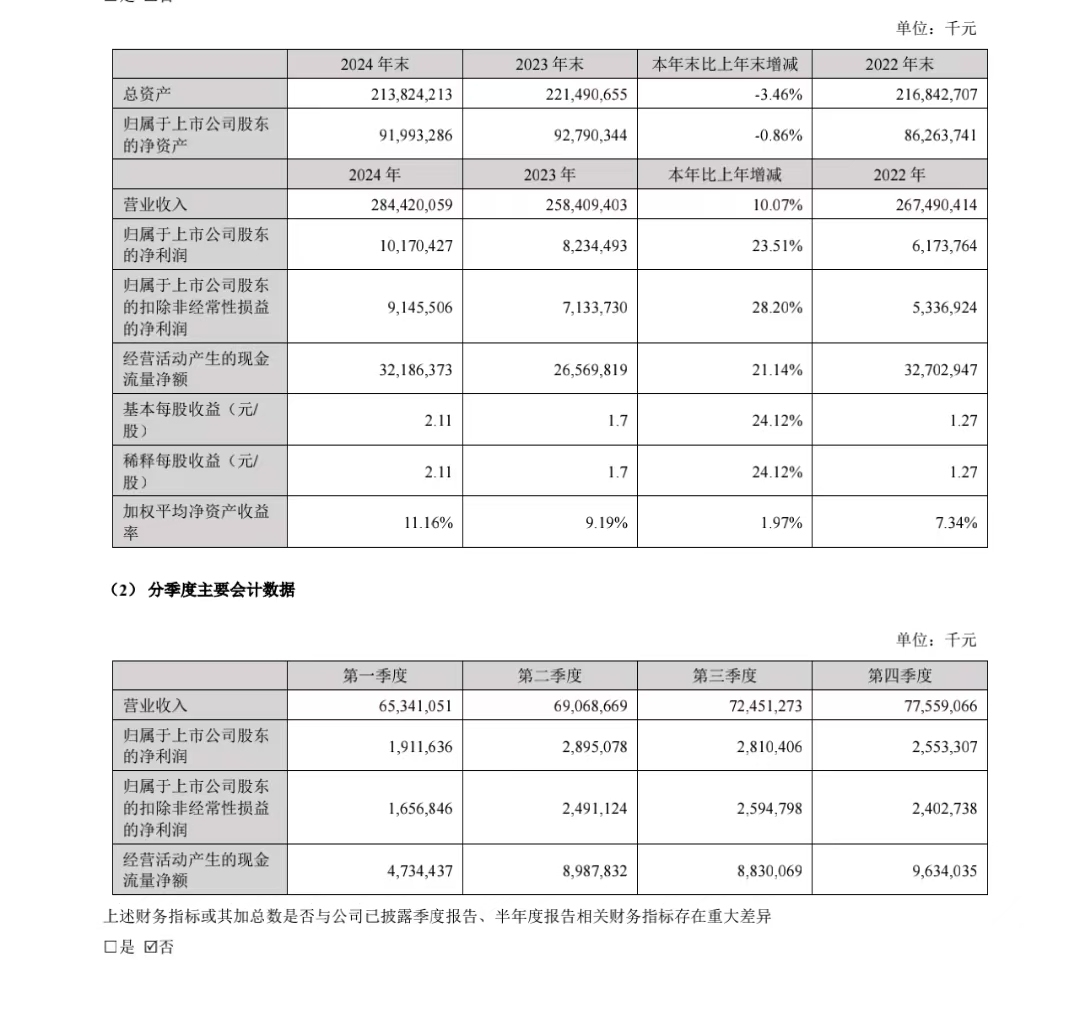2024年,顺丰控股成功登陆中国香港资本市场,成为快递物流行业首家A+H公司,在A+H的转型元年。3月28日晚间,顺丰控股(002352.SZ ;6936.HK)发布2024年年度报告,2024年实现营业收入2844.20亿元(人民币,下同),同比增长10.07%;实现归属于上市公司股东的净利润101.70亿元,同比增长23.51%;EBITDA利润达到326.95亿元,同比增长11.05%;实现基本每股收益2.11元,同比增长24.12%。