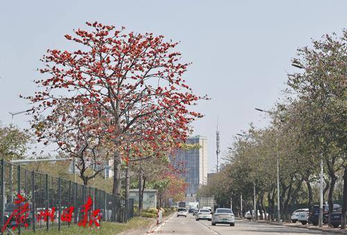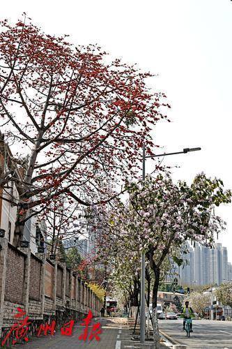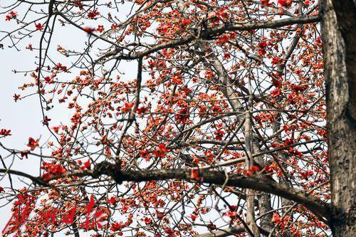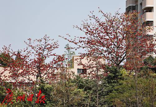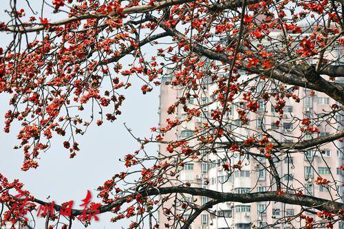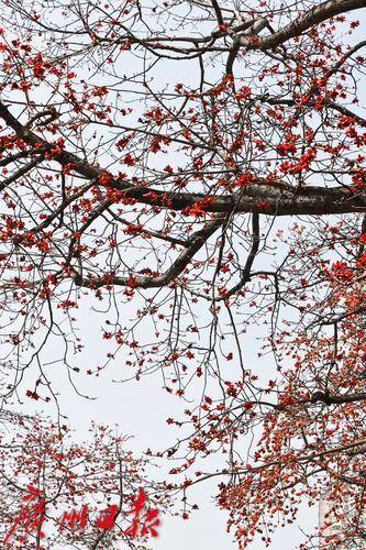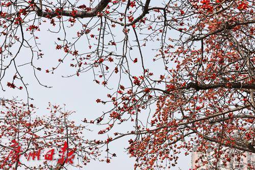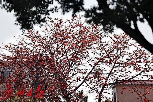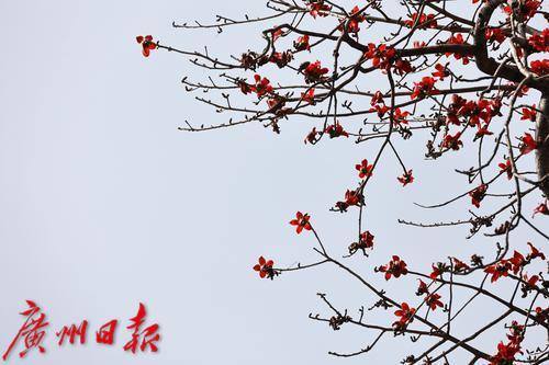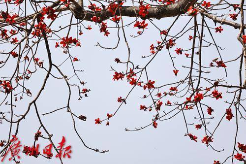 近日,广州市红木棉花绽放,有的在公园、街道上,有的在村口和院子里,朵朵红花盛开,总让人惊喜。位于华南师范大学马克思主义学院门前的木棉花开得红艳,从树底下仰望,红花布满天空,吸引了许多学生拍照。